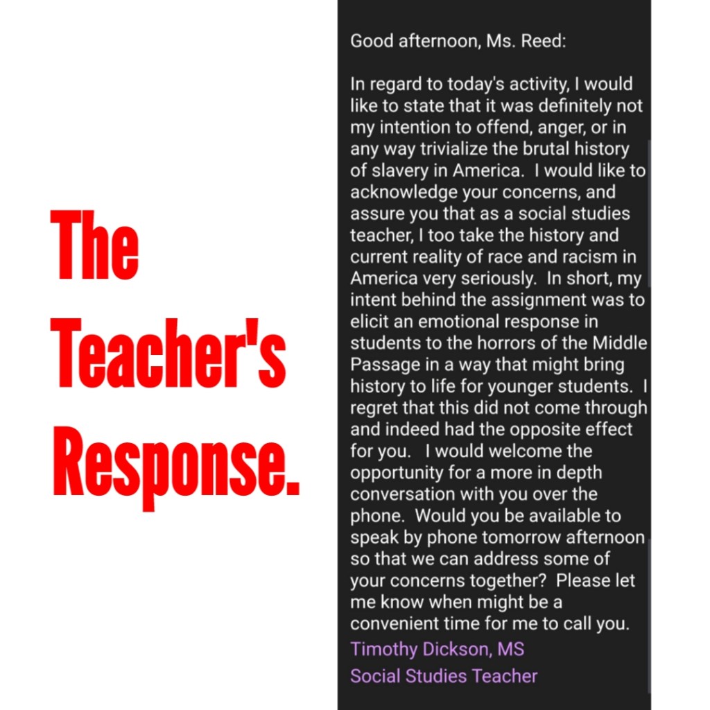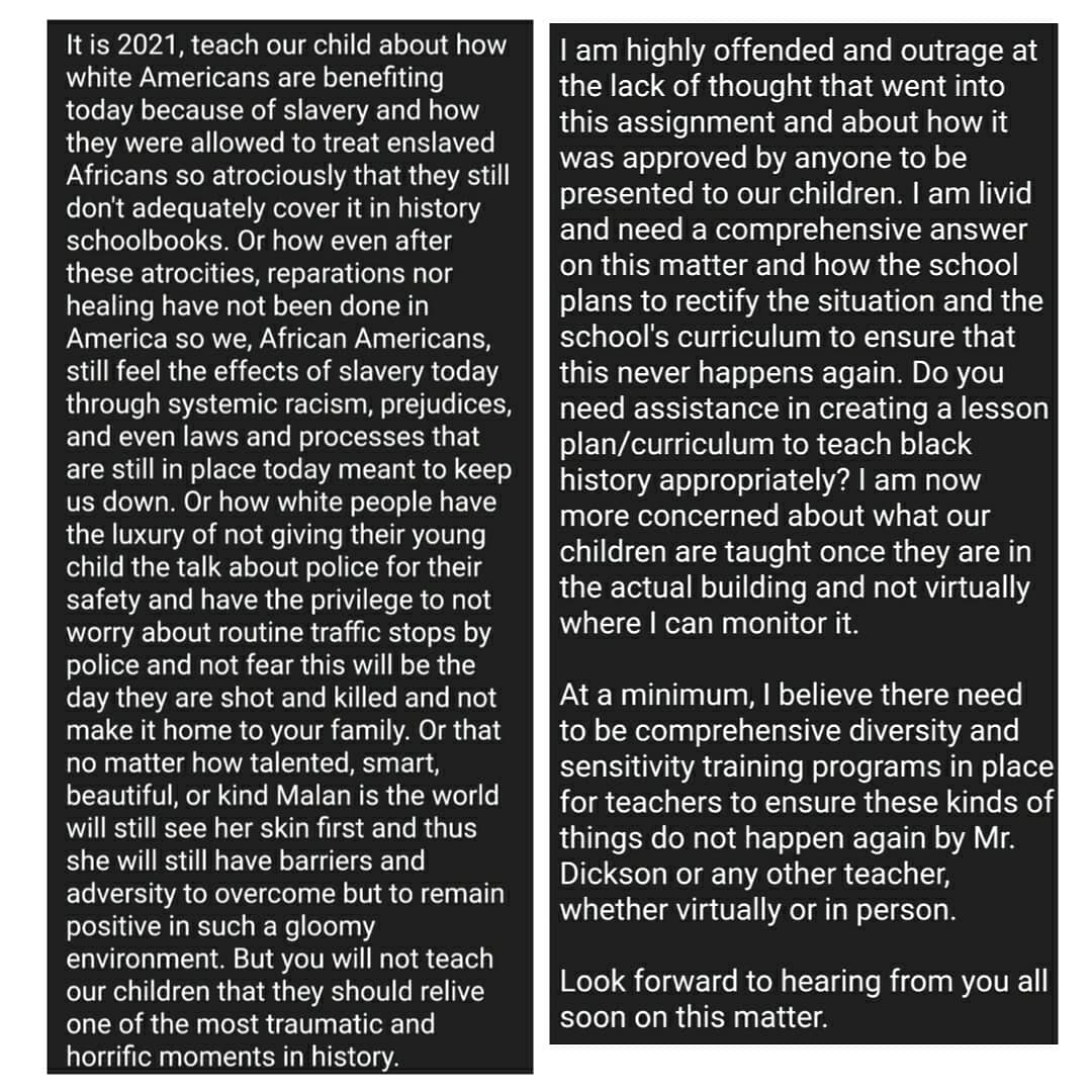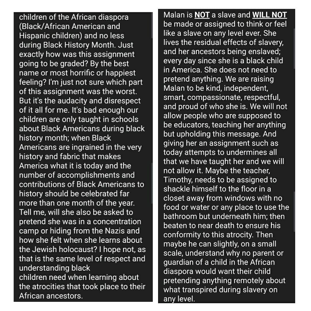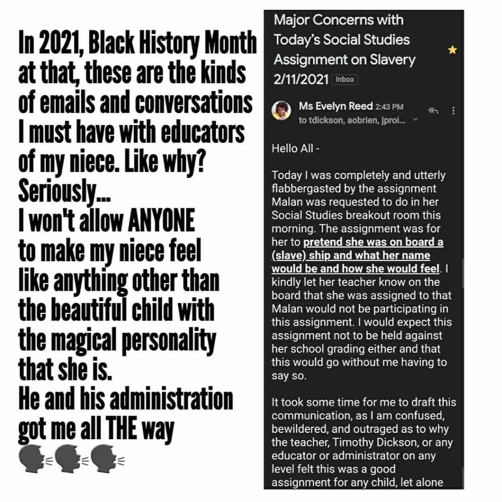 As my niece’s Learning Coordinator through her current virtual learning environment with the Philadelphia School District Charter School Community Academy of Philadelphia (CAP); on February 11, 2021, during Black History Month at that, I am trying to understand why I have to send emails like this to my niece’s Social Studies Teacher and his administration because he thought it was a good lesson on 2/11/2021 to ask children of the African Diaspora to pretend they were onboard a slave ship and what their name would be and how they would feel🤬😡🤬… My niece is in a third grade. She is a beautiful black child that is only 9 years old and so long as I have breathe in my body, she will NEVER be or even pretend to be a slave on any level for any person.